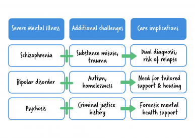 Complex mental health refers to situations where a person is living with a severe mental illness, learning disability, or autism and has additional challenges that affect their wellbeing and recovery - such as trauma, substance abuse, other mental health conditions or a history with the criminal justice system.